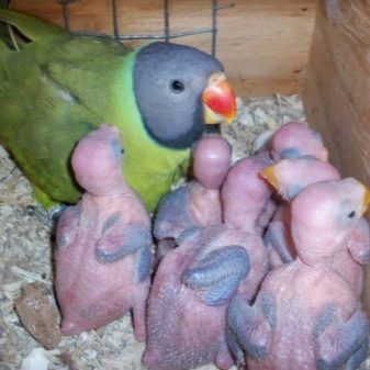 Necklace parrots breed well at home. Offspring can be expected from a couple at the age of three years - it is by this age that the physiological development of birds is fully completed. In addition, younger individuals hatch eggs poorly, and when chicks appear, they are poorly taken care of. If the bird is old, this is also not very good - there will be weak offspring from it.