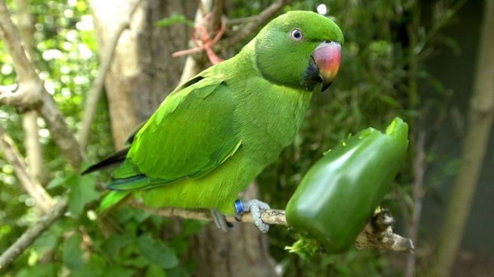 - Pink-breasted (Psittacula alexandri). The size of the adult is 30-35 cm, the tail length is 22 cm. The main color of the plumage is green, the head is blue, there are black stripes on the forehead, the breast and part of the abdomen are pink. It lives mainly in some provinces of India, where it settles in huge flocks and ravages rice and other agricultural plantations, for which it is subjected to mass destruction by people.