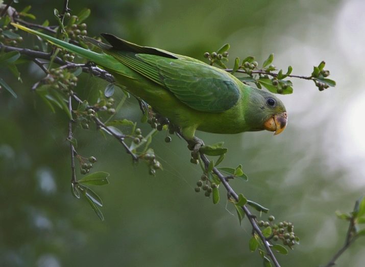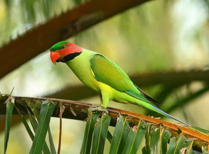 - Emerald (Psittacula calthropae). It lives in Sri Lanka. It has a body size of 30 cm and a tail length of 13 cm. The main color is blue-green, the head and upper body are blue with a grayish tint, and there is a bright green necklace on the neck. The main feathers on the tail are also blue, and the tip of the tail is yellow. In the male, the beak is red-brown, in the female - black.