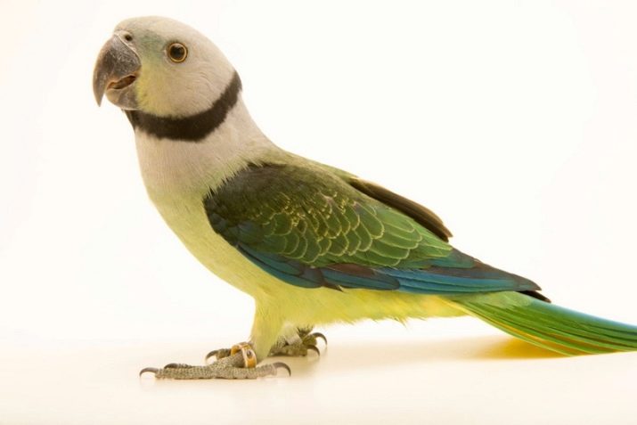 - Malabar (Psittacula columboides). It lives in some parts of India. The length of the body is standard for the genus Necklaces - 35-36 cm, the length of the tail feathers - 20-25 cm, the upper part of the body is gray, the lower green with a bluish hint. Around the eyes, on the abdomen and lower part of the tail, the male has a yellow-green fluff. In females, blue tones predominate in color.