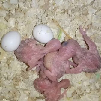 Chicks begin to peck an egg from the blunt end. It is quite rare, but a case is possible when two chicks (twins) live in one egg. Parrots begin to feed their cubs 12 hours after the first hatch. It is usually not difficult to feed chicks for adults at home. The female burps the absorbed food in the beaks of the chicks. The misconception about the great appetite of chicks is widespread. In fact, they stop asking for food as soon as their goiters are filled.
