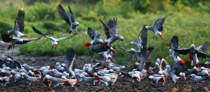 In the dense forests of West Africa lives one of the most attractive species of parrots for humans - the Jaco or the gray parrot. Medium-sized birds with ash-gray plumage and a bright red even tail have a body up to 35 cm long and a wingspan of about 65 cm. Gathering in small flocks, they inhabit tall mangroves on which they nest and spend the night. They feed on greasy fruits of oil palm, fruits, herbs, and can eat snails. Gathering in large flocks, parrots cause damage to agricultural plantations, for which they are caught for sale and meat.