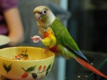 At home, parrots feed on a grain mixture. Food for canaries, oatmeal and other cereals, millet, and sunflower seeds are quite suitable. The main thing is not to overfeed the bird. An adult bird needs about one and a half tablespoons of food per day. Parrots with pleasure eat finely chopped or grated vegetables and fruits, various greens.