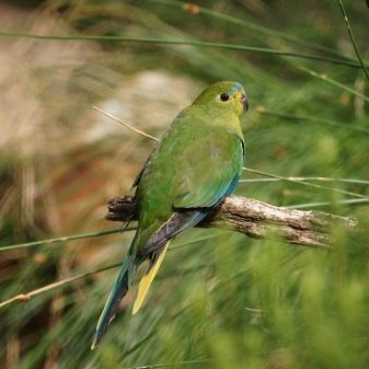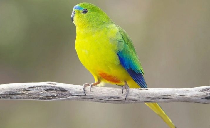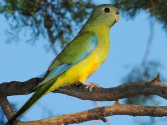 In some sources, this species is also called orange or gold-bellied. The scientific name is Neophema chrysogaster. A parrot lives on the islands of Tasmania and King. Refers to an endangered species, the trade of which is prohibited. The size of the golden parrot is not more than 20 cm. The main color of the male is emerald green, on the forehead there is a blue spot with a blue tint, the cheeks are yellowish, the breast and belly are protective-marsh. On the lower abdomen there is a bright orange spot, for which the view got its name.