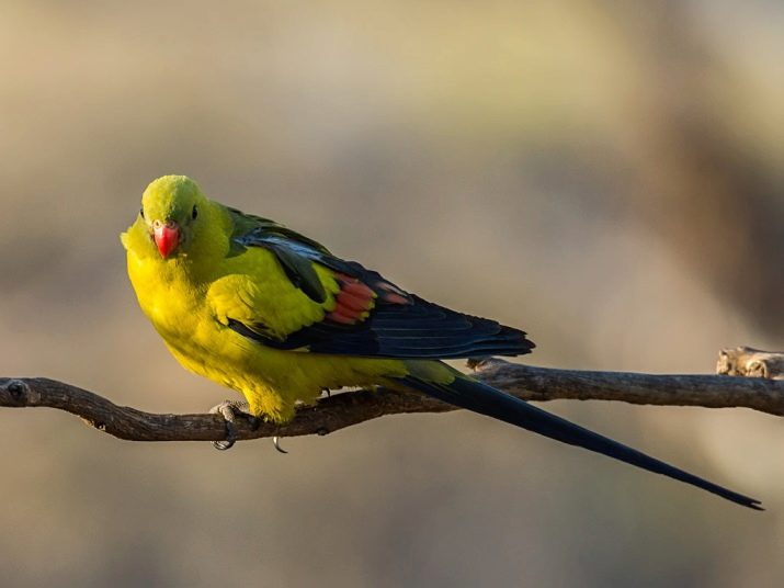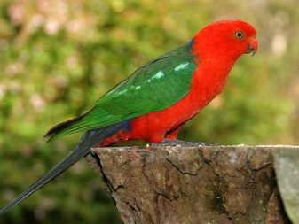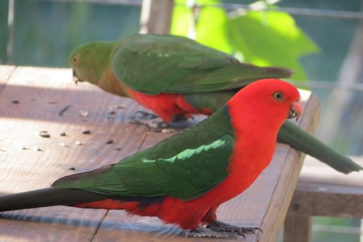 - Royal has a body length of 40 cm and a tail of 21 cm. The male has a neck, head and abdomen bright red, the back with wings is green, and the beak is orange. The female, in addition to these flowers in the plumage, also has a blue, and the beak is black-brown. But this coloring appears only in the second year of life.