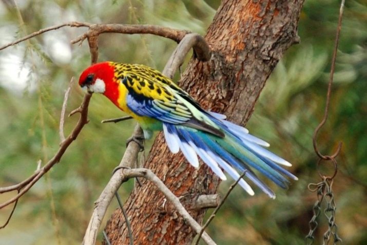 - Rosella different variegated scaly color. The older the individual, the brighter the color.The parrot has a tail length of 25-35 cm, life expectancy is up to 15 years. The bird is timid: after the purchase, you should not catch it in your hands with your hands and transplant it into a cage. The carrying pole is installed in a new housing, the cage and the carrier are pushed to each other, the rosella will fly onto its own pole.