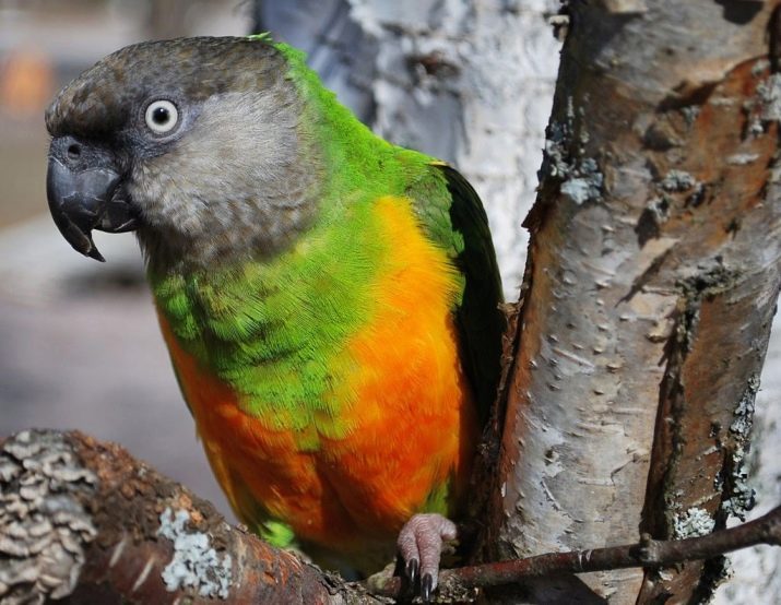 - Senegalese Parrot different in size of 35 cm, serious and independent disposition, life expectancy of 25-40 years, ability to train. The feathered one loves to sleep (at least 10 hours a day). The Senegalese has a green back, wings and tail; yellow-orange abdomen, dark gray head, crest absent.