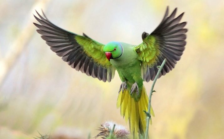 - Ringed parrot - a beautiful view, but has a vociferous voice. In birds, the body length is 30-50 cm, green plumage, a long tail in the form of a wedge. They have a good level of adaptation to captive life (they will live for about 30 years), while they are trained in human speech.