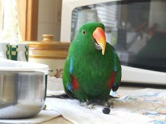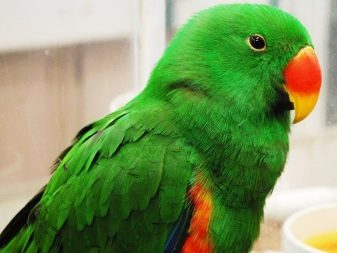 Green parrots, or eclectuses, are quite large in size - they can grow up to almost 40 cm, and weigh more than 0.5 kg. Their color is also quite original: