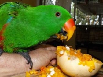 They often eat, mainly food should consist of vegetables, fruits, berries, excluding avocados - this fruit can even cause death. Specialists recommend very rarely feeding eclectus with lean meat - in small quantities, since in nature birds eat a large number of insects, this can serve as a certain kind of compensation. Small parrots are fed with a spoon or syringe.