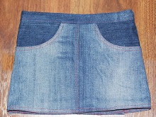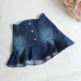 A simple, straight denim skirt with an elastic band. Take the old jeans. Cut off the bottom of the leg and ragged seams. We sew them.