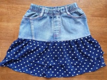 Combined skirt. Always in fashion. Combining jeans is easy and simple, especially if mom is a needlewoman. Leaving up from the old skirt and finishing with any material of “cheerful” colors (especially polka dots and plaid fabrics are especially popular this year), we get a fresh skirt almost for free.