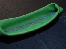 Thick gum - we buy a belt in a store. We tune it in a circle in a zigzag or make a belt of dense knitwear ourselves. To do this, bend the fabric in half, insert the elastic and sew to the belt.