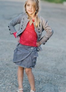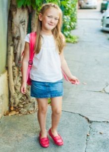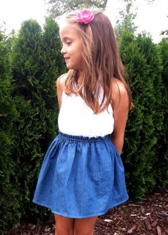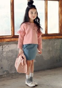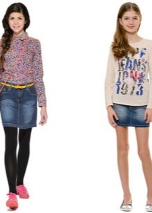 As practice shows, a denim skirt goes well with a t-shirt, with a blouse. A short denim jacket with white beads and a skirt matched to the tone create the effect of an “adult” lady. A bright T-shirt and a light blue skirt look great.