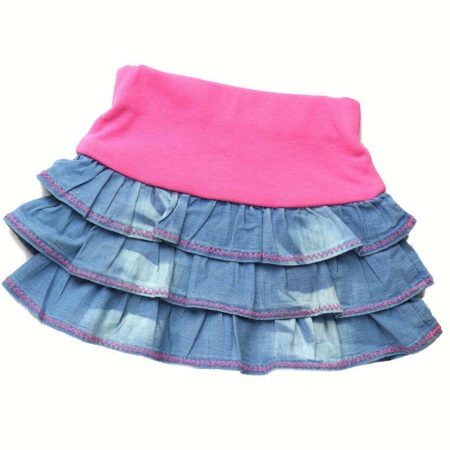 To experiment at home will help old, unnecessary jeans. For example, if your girl has already grown from an old skirt, but in her belt she’s not yet small, then you can just sew one wave-shaped strip of a suitable color. Or take a colored summer cloth, cut off with strips of different lengths, sew - here comes the new skirt. And another option - crochet a line of the required length to a straight skirt, and the product looks beautifully both plain and from combined threads. It is better to take the thickness of threads number 10, if you knit with number 20, then the knitting will be more voluminous, also beautiful.