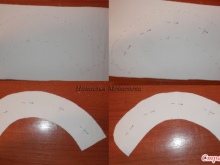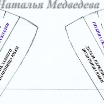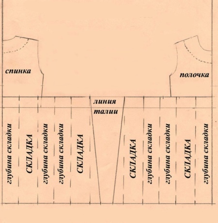 It must be cut along the waistline, and the skirt should be modified taking into account folds. A double width is taken for each crease. Example: the width of the fold is 1.5 cm (1.5 cm x2 = 3 cm). Starting from the middle of the front and back, set aside the width of the fold. There may be several folds. In finished form, the skirt pattern should look like this: an additional part of the folds are pasted into the skirt drawing. The photo shows an example of how to modify the pattern for the folds.