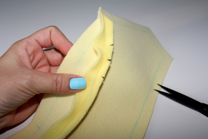 On a stitched collar in these places, notches (in the form of small triangles) are needed. Manicure scissors to carefully and evenly cut them. Thus, excess tissue will go away. And the collar will be straight from the front.