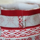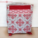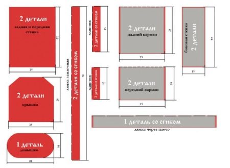 - We cut out seven rectangular blanks from fabric with ornament. Two pieces each for the back pocket 25x25 cm, for the front pocket 16x25 cm, for the side walls 15x32 cm and one blank 8x130 cm for the fabric strap over the shoulder.