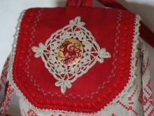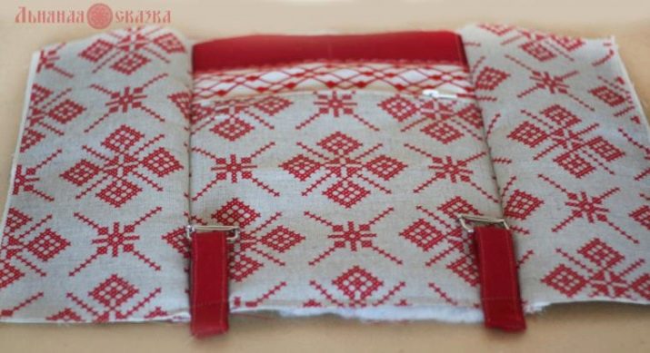 - We sew parts at the backpack lid, iron, insert the upper half of the clasp, decorate, and then sew to the main workpiece along with satchel straps. On the sides we attach loops with inserted half rings.