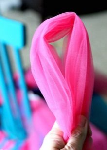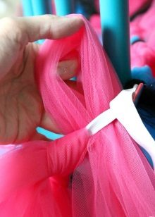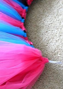 - Twist a small roll from each strip of tulle, find the middle and tie the twisted tulle around the elastic with a regular knot. You need to make sure that you do not squeeze the gum and at the same time tie the tulle so that its strip does not dangle. In addition, the ends of all cuts of tulle should be obtained after tying the same length, if you did not plan to make them different.