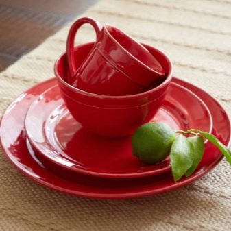Bright and emotional red color is liked by courageous people who are ready for experiments. This color is more than others capable of stimulating appetite, therefore such dishes are often chosen for children who are naughty at the table. It is worth noting that such a bright dish is absolutely not suitable for an emotional family feast. Red tires very quickly, and even annoys someone. Therefore, guests will have a desire to eat and leave quickly.But if you choose a set of this color for breakfast, then this, perhaps, will be the best option. A set of red-white or black-red colors looks great. For example, cups may be black and plates red.