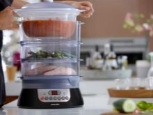 A successful unit, both small and roomy. There are three tiers in which you can cook, you can put the bowls in pallets or nets.Takes up very little storage space. The steam boiler is controlled automatically, there is a timer, the ability to maintain the temperature of the food. High quality assembly, dishwasher safe. If the water runs out, the appliance will give an appropriate signal.