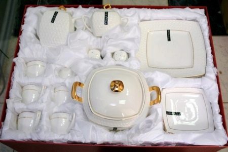 - Leading manufacturers pack items of table or tea sets in a boxin which protective gaskets and gaskets are provided. The packaging shows the manufacturer's data with the address.
