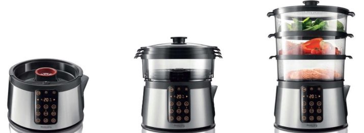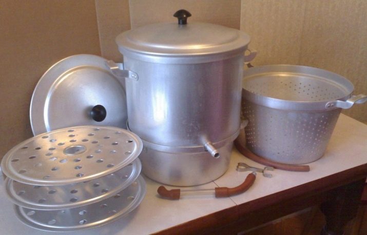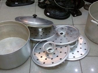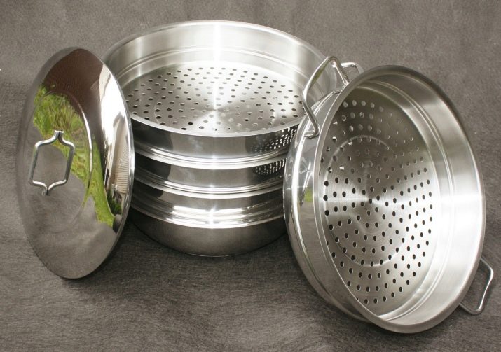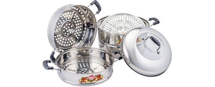 Water is poured into the bottom, and all other "floors" are used to bookmark products. The design is necessarily made collapsible, and on the first tier there is a trellised bottom, approximately the same as in the colander. The middle of all tiers is equipped with a special round hole that allows you to support the movement of steam throughout the volume. Therefore, wherever the dish is placed, it will be cooked evenly and simultaneously with food at other levels.