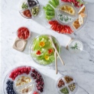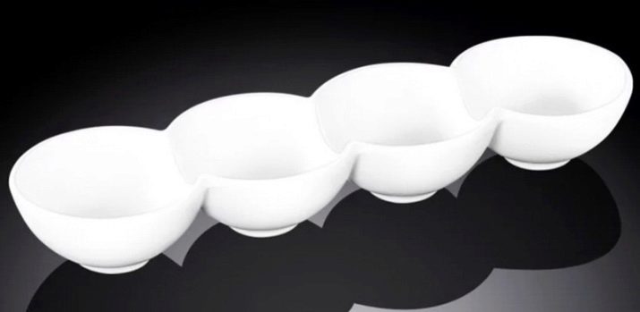 Even if you have a regular tea party or a children's party, an original plate from several compartments will be very useful. You can put sweets, cookies, small cakes and other sweets on it. If you often arrange feasts with a large number of guests, take a look at the prefabricated models on the stands. Depending on the occasion and mood, you can change the serving, using a set of mini-bowls as a single structure, standing in the center of the table, or as portions of a dish or appetizer for each guest.