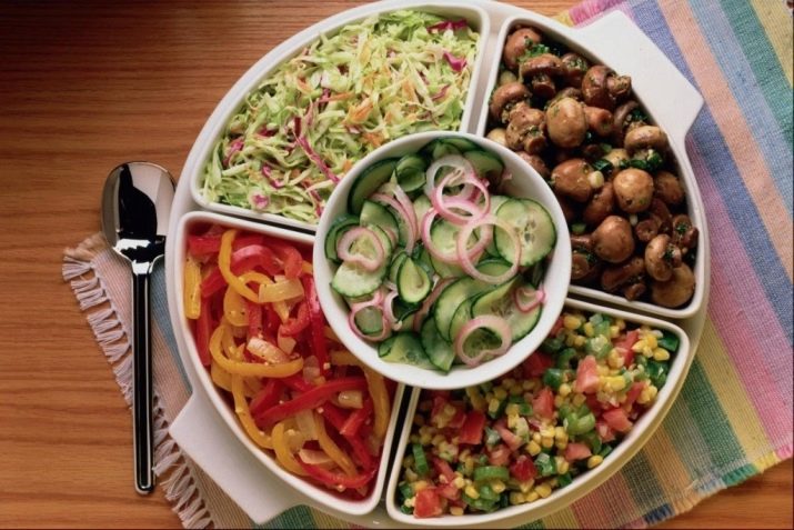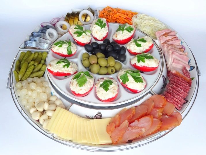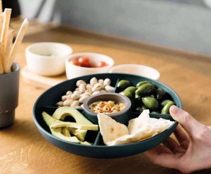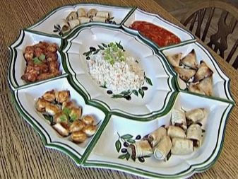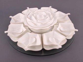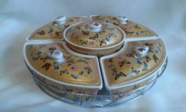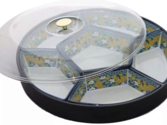 Separately, it is worth highlighting the rotating models. It can be a spinning dish on a high leg with partitions or a set of portioned bowls. Design can be anything. Such designs are very convenient. Everyone at the table can turn the dishes to choose the right snack. In this case, you do not have to pick up the item, distract the hostess or other guests with a request to move this or that bowl.