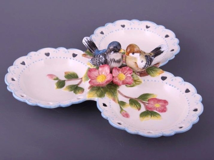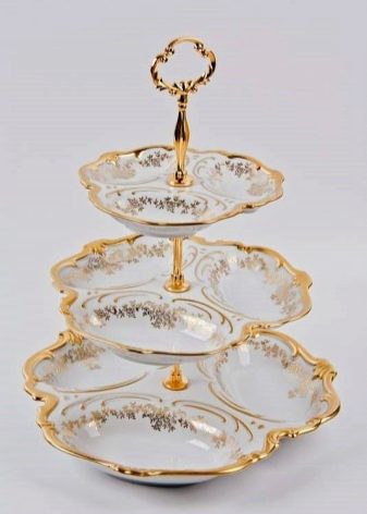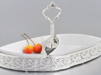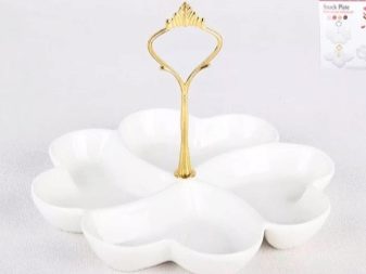 This can be a solid plate, consisting of several curly sections or a collapsible design, combining small bowls. The design and shapes of the scallops are diverse. There are round, oval, rectangular options on sale. There are models in the shape of hearts, leaves. A scaffold can even have the appearance of a flower with graceful petals (mini-salad bowls) or a bird with beautiful wings.