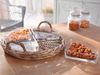 In this case, everyone can take the outlet with a snack and put it in front of him. Moreover, all the constituent elements complement each other perfectly. This makes the serving more stylish. Compound scissors are diverse. Segments can be combined into a large ceramic or crystal composition. They can also be placed on a beautiful tray made of metal or glass. Wooden and wicker coasters are interesting.
