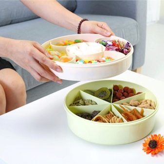If you have a company of happy friends, a plastic dishwasher with chips, nuts, dried fruits will be very useful. It can even be put on a small rolling table to combine a snack with watching TV. If the feast is more serious, sectional dishes filled with salads, fresh and pickled vegetables will help you out.Even ordinary homemade preparations in such a capacity will look like an expensive dish from a restaurant. In addition, you can save space on the table.