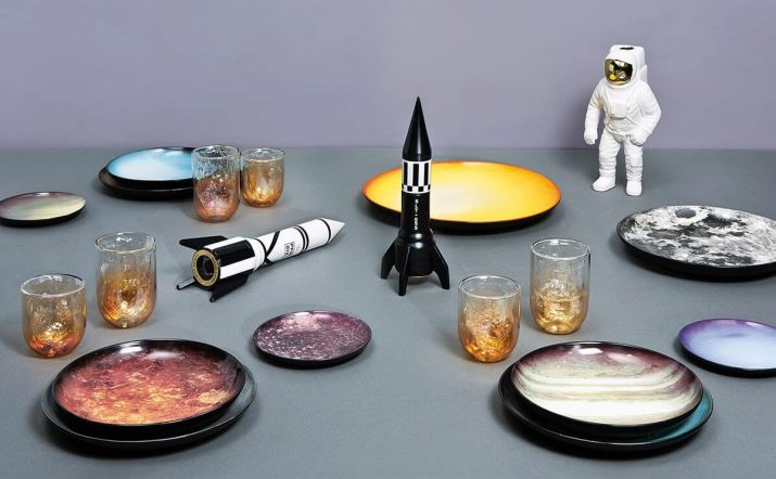 The fashion trend is square or rectangular plates. The main advantage of this type of cookware is the ability to fit more food. The original solution for flat plates is the design in the form of a mirror and vinyl records. Also, a colorful version of the service can be called a set of plates in the form of planets of the solar system. Fans of certain dishes may be interested in dishes made in the form for a particular dish, for example, chicken with french fries.