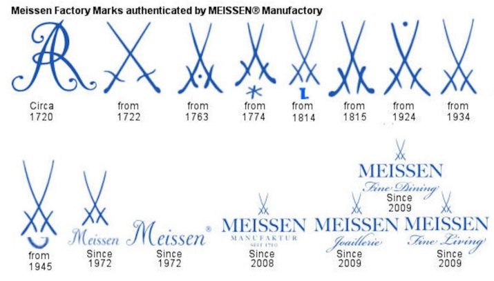 Forged porcelain from Meissen from the very beginning of its existence.In 1772, they came up with a trademark - two crossed swords, it changed over the years, but the essence remained the same. Today, under the swords there is the inscription Meissen, which means that such a product was made later than 1974.