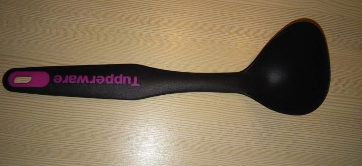 - Ladle Tupperware issued in black and red strict colors and can claim to be a worthy decoration of any modern interior. The width of the working bowl is 9.5 cm, the length of the handle is 28 cm. Polyamide is used as the manufacturing material, which can easily withstand temperatures up to 150 degrees. At the same time, the product does not deform, does not emit toxic substances into the environment, and, due to low thermal conductivity, does not heat up even after a long stay in a pot with hot soup. Such a soup ladle costs 499 rubles.
