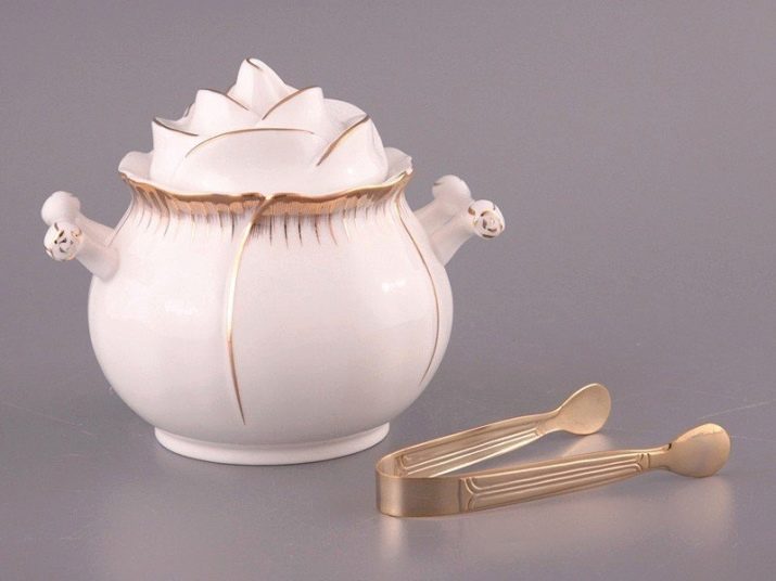 A white sugar bowl with handles decorated with gold paintings looks beautiful. A gilded tongs make the kit original, giving it a noble and expensive look.