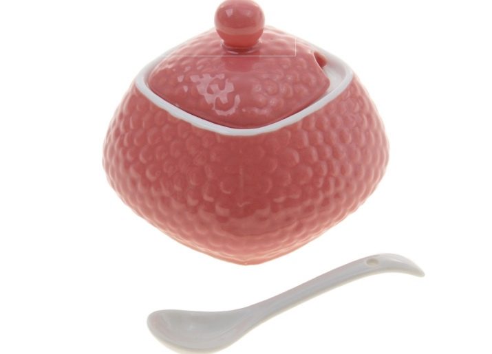 - Set with a spoon and a lid. Such a set has a special spoon “scoop”. Such sugar bowls are good for hygienic reasons. Since you do not need to look for where to put a spoon after use. Such options look harmonious, since both the sugar bowl and spoon are made in the same style and complement each other. But there are also disadvantages in such models - a notch for a spoon can make the model leaky, which means it is unstable to the penetration of odors and moisture.