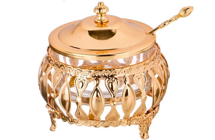 - Metal. Metal sugar bowls are widely in demand due to their durability and strength. The most popular options in this segment are silver or cupronickel sugar bowls and stainless steel options, since they can preserve the taste and properties of sand. They also perfectly complement the interior. You can find an unusual sugar bowl in the form of a metal cube or more traditional, but no less beautiful options in the classical or Baroque style.