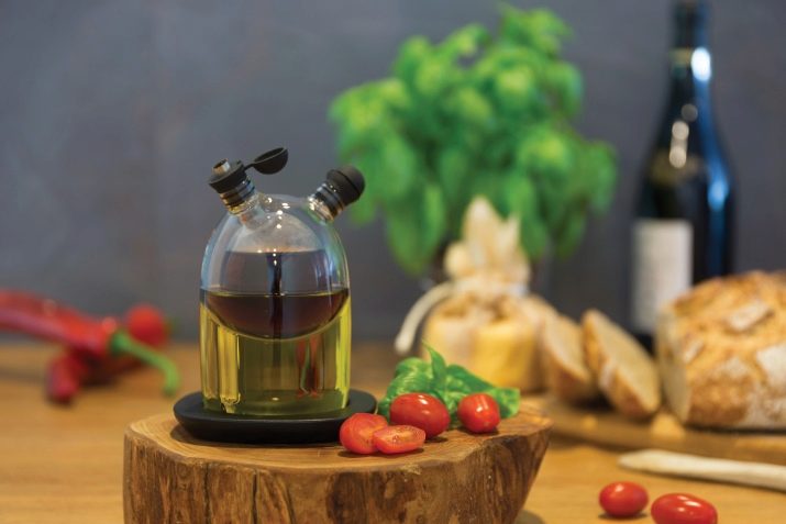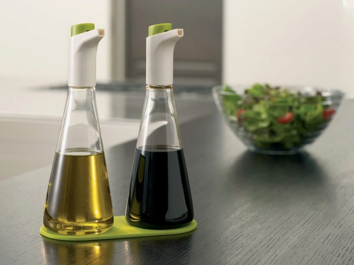 Dispensers for oil or vinegar can be purchased both separately and in beautiful sets. Options 2 in 1 look interesting when a large vessel is divided into two halves, which makes it possible storage of two liquids at once. In this case, the vessels will be completely isolated from each other. It looks beautiful if the container inside is curly-shaped and made of colored glass.