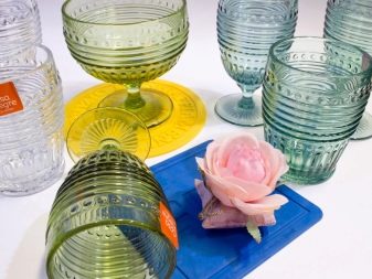 Brands such as Luminarc and Pasabahce. Their chic selection of glass dishes will allow you to find the most suitable set for any possible style of the kitchen. These manufacturers offer their customers a choice of not only one-color colored glassware, but also objects with an original pattern.