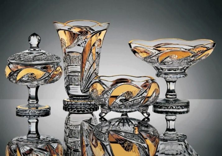 Elegant glasses look especially beautiful in this technique. Another set that will decorate any celebration is Bohemian glassware. All these stylish wine glasses, vases for sweets and fruits, piles and decanters for vodka, glasses for wine will become your pride and cause the enthusiastic looks of your guests.