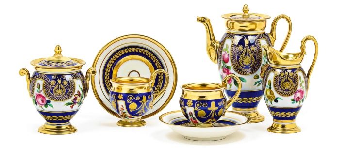 Empire or Art Nouveau dishes are often artsy porcelain, complex shapes and an unusual print. This style is also characterized by glassware with mosaics.