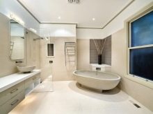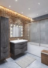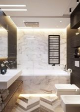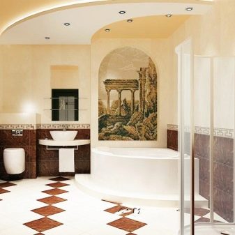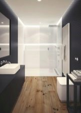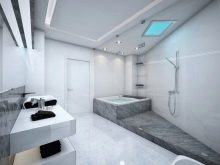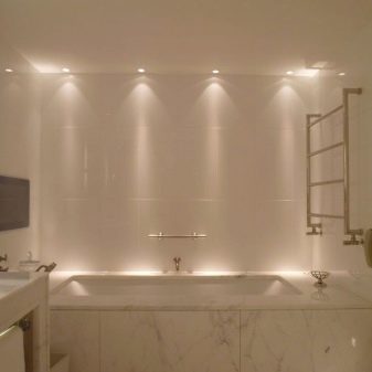 Creating a protruding niche on the ceiling will help to zone the space and visually highlight the location of the bath. The LED strip in the edging will not only outline the protrusion, but will also become an additional light source. To increase the light in the room, additional spot spots should be mounted in a niche.