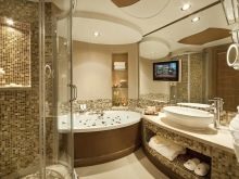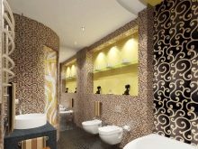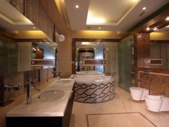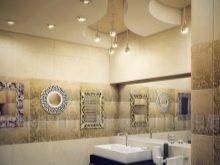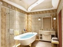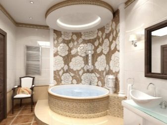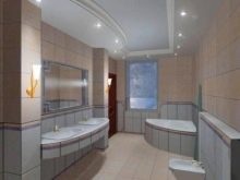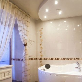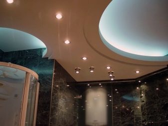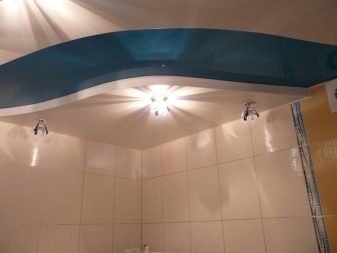 If the bathroom is small and the standard ceilings seem boring, then you can do two-level design. In this case, the protrusion can be made in the form of a wave or a circle. This option will help to visually highlight the area where the bath or shower is located.