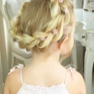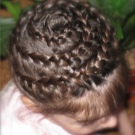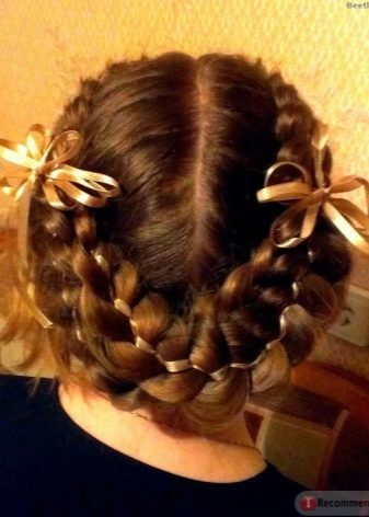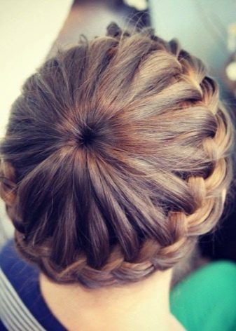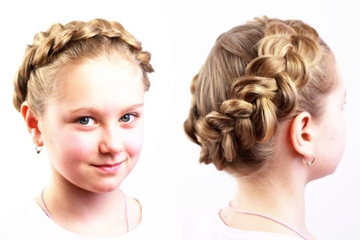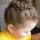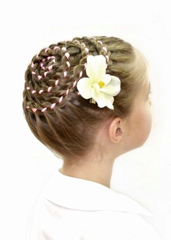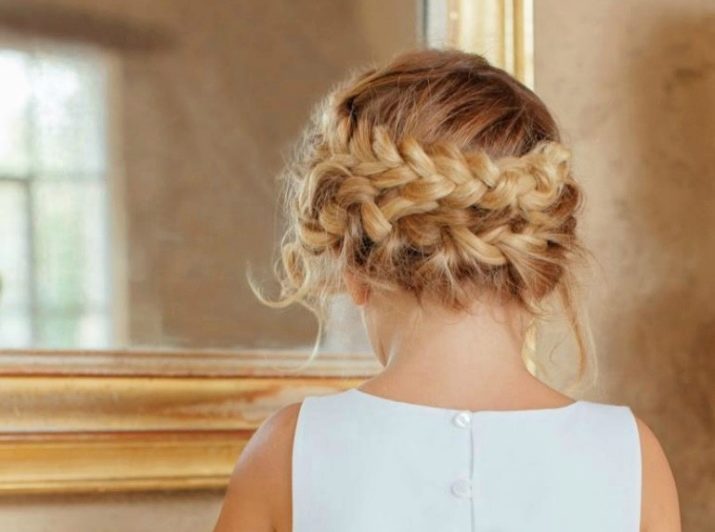 For a festive event, a “basket” is woven around the head. To do this, according to the type of French braid, you should gradually select hair into one braid in small strands. Of course, to make such a wreath is very difficult, but the result will simply stun you. And if you diversify your hair and weave a ribbon there, then the girl will eclipse everyone. If the idea of ribbons did not appeal to you, then you can add a “twist” with a bow or stained glass hairpins.