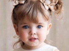 As an original addition to a children's hairstyle, you can use a variety of hair clips and bows, as well as hoops and bandages - hairpins are best left for special occasions. Little girls very often wear bangs, she was and remains in trend, she looks especially impressive on short and medium tresses. The most common is straight bangs, as well as oblique and long ones - each mother can create an individual style for her baby.