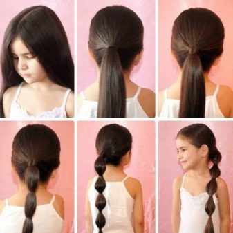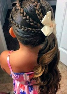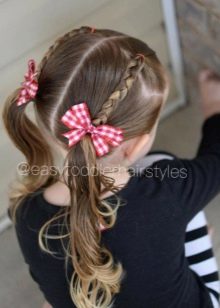 Usually a pair of tails is collected high on the crown, and owners of curly hair can collect many tails all over their heads. And with the help of beautiful accessories, you can even make the simplest ponytails elegant and festive through the use of satin ribbons, small colored bows and stylish hairpins. In this form, the girl can be sent to any gala event. To create styling based on ponytails, it is better to use soft rubber bands or silicone - they firmly fix the hairdo and at the same time do not cause the child the slightest discomfort.