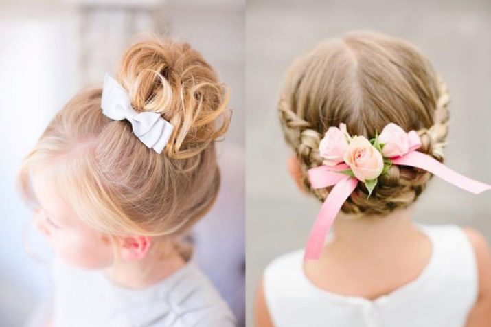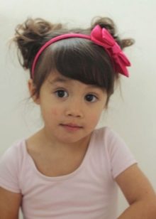 A bundle is very popular among mothers - this is a universal hairstyle for a little face, which is suitable for girls doing gymnastics, dancing or another sport. However, the uniqueness of the bunches lies in the fact that if you add a small decor to it - a flower or a bow, then in the blink of an eye the hairstyle turns into a festive one and the baby looks like a real fairy-tale princess.