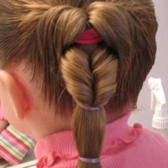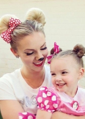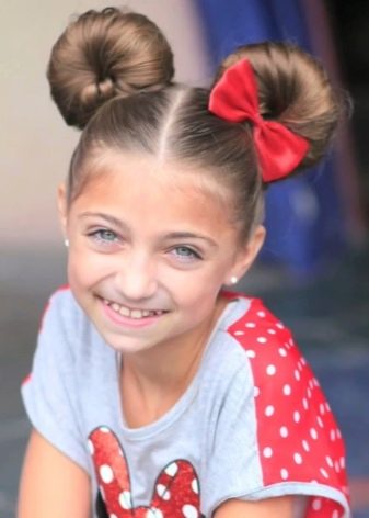 For the most fun and mischievous girls, the ears of your favorite cartoon character - Mickey Mouse - are suitable. This is a good hairstyle for very long hair. First, in the upper part of the head, two tails are collected, clamped with elastic bands, and a bundle is made from the remaining hair. A similar hairstyle can be done both as a daily and as a festive option.